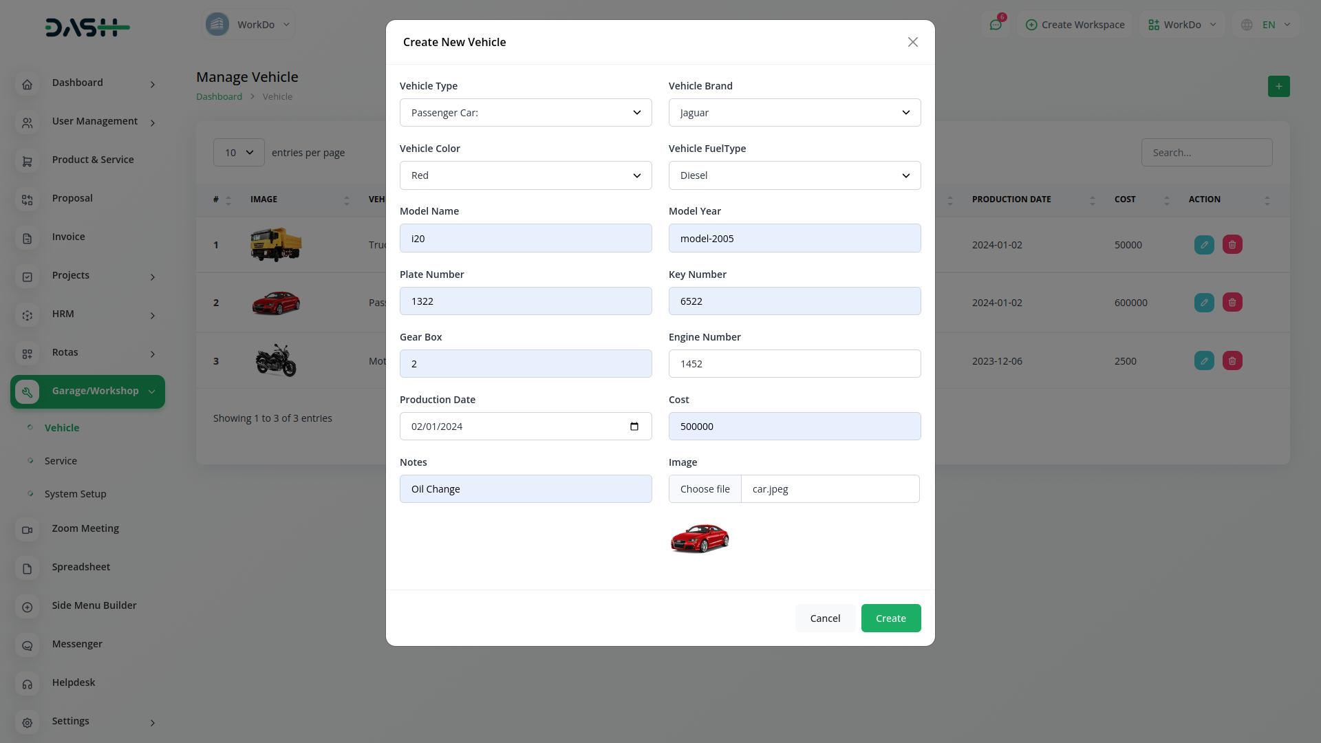 Garage/workshop management system streamlines operations by allowing seamless creation and tracking of vehicles and services. Effortlessly input vehicle specifics like make, model, and year for informed decisions. Define services with names, descriptions, and costs, aiding transparent cost estimation. This unified system catalogues services, empowering efficient workshop management and elevating customer satisfaction.