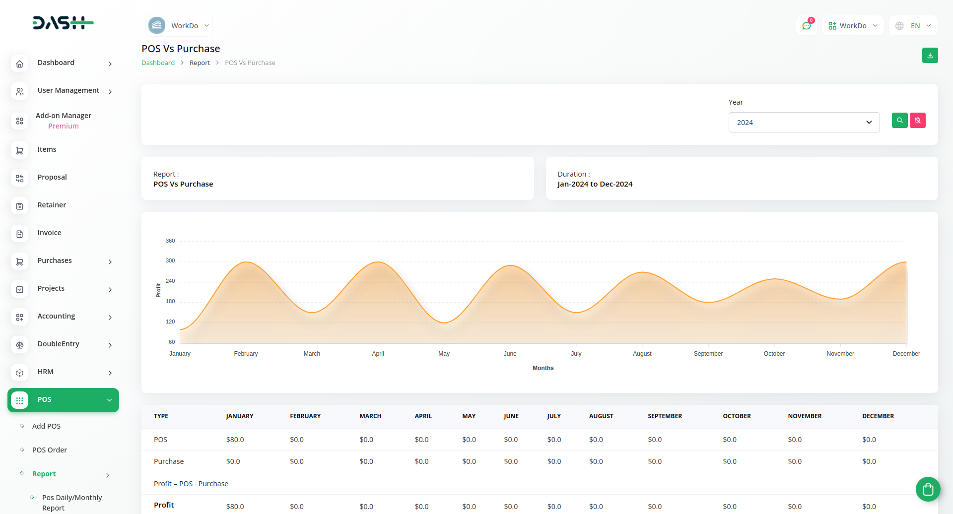 Welcome to the POS Module in Dash SaaS, your ultimate solution for streamlined sales management. Our platform offers a user-friendly dashboard where you can easily navigate through your sales activities. At the heart of the dashboard is a dynamic chart representing your sales reports, providing valuable insights into your business is performance. Whether you are a small retail store or a bustling restaurant, our POS Module empowers you to efficiently manage your sales process from start to finish.