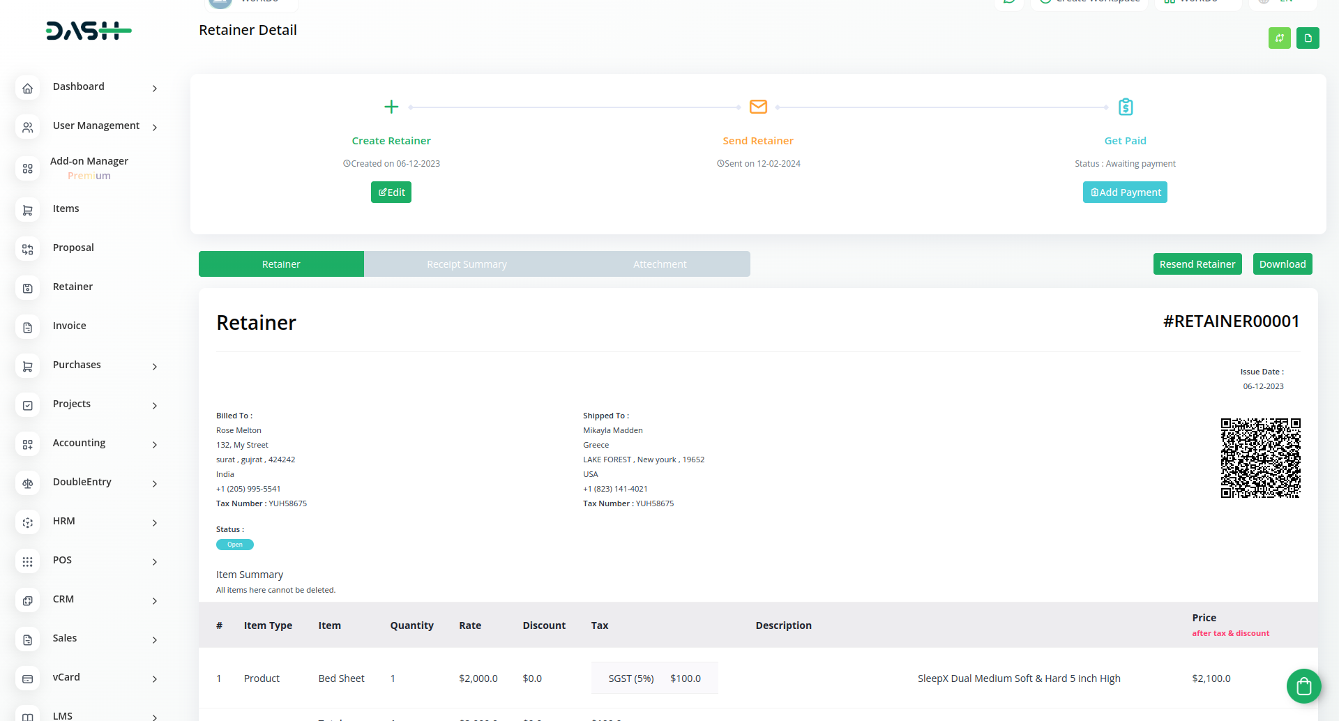 Retainer invoices are documents the firm can provide to the client to ask for funds prior to the project starting. Its a method of securing services for use when required. In other words, its a form of deposit or pre-payment.