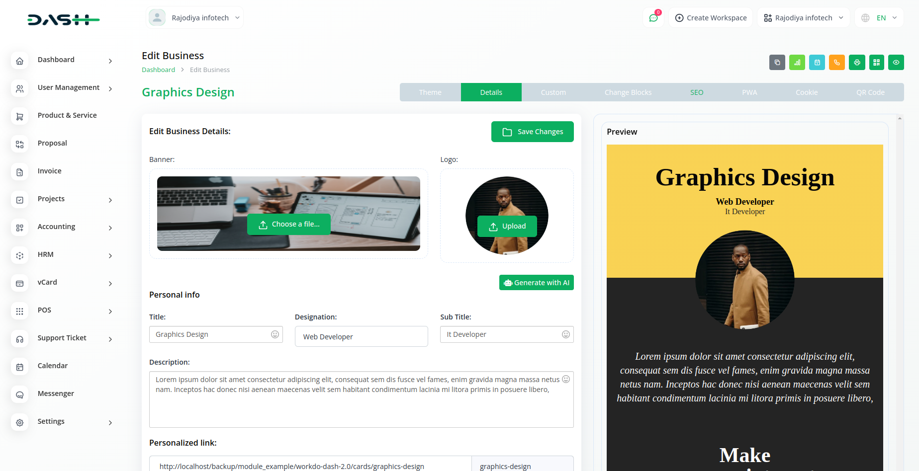 Customize your digital business card to match your brand.Choose from 21 beautiful themes with it`s unique colors.Add,modify update your business information quickly and easily.